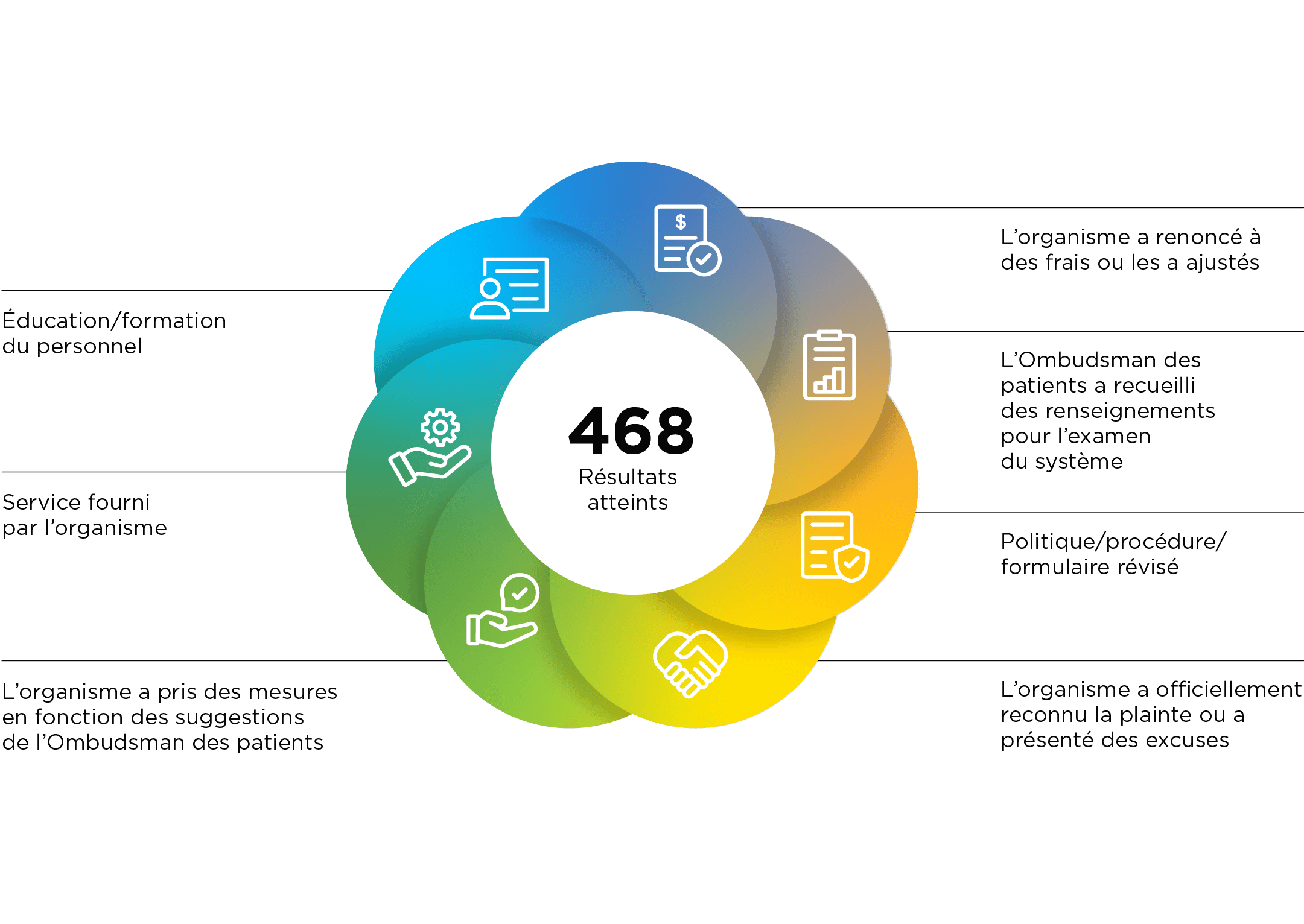 Les résultats du règlement incluent l’organisme de soins de santé fournissant un service, reconnaissant ou s’excusant pour ce qui s’est passé, garantissant la formation ou l’éducation du personnel, ou mettant à jour ses politiques et ses procédures.