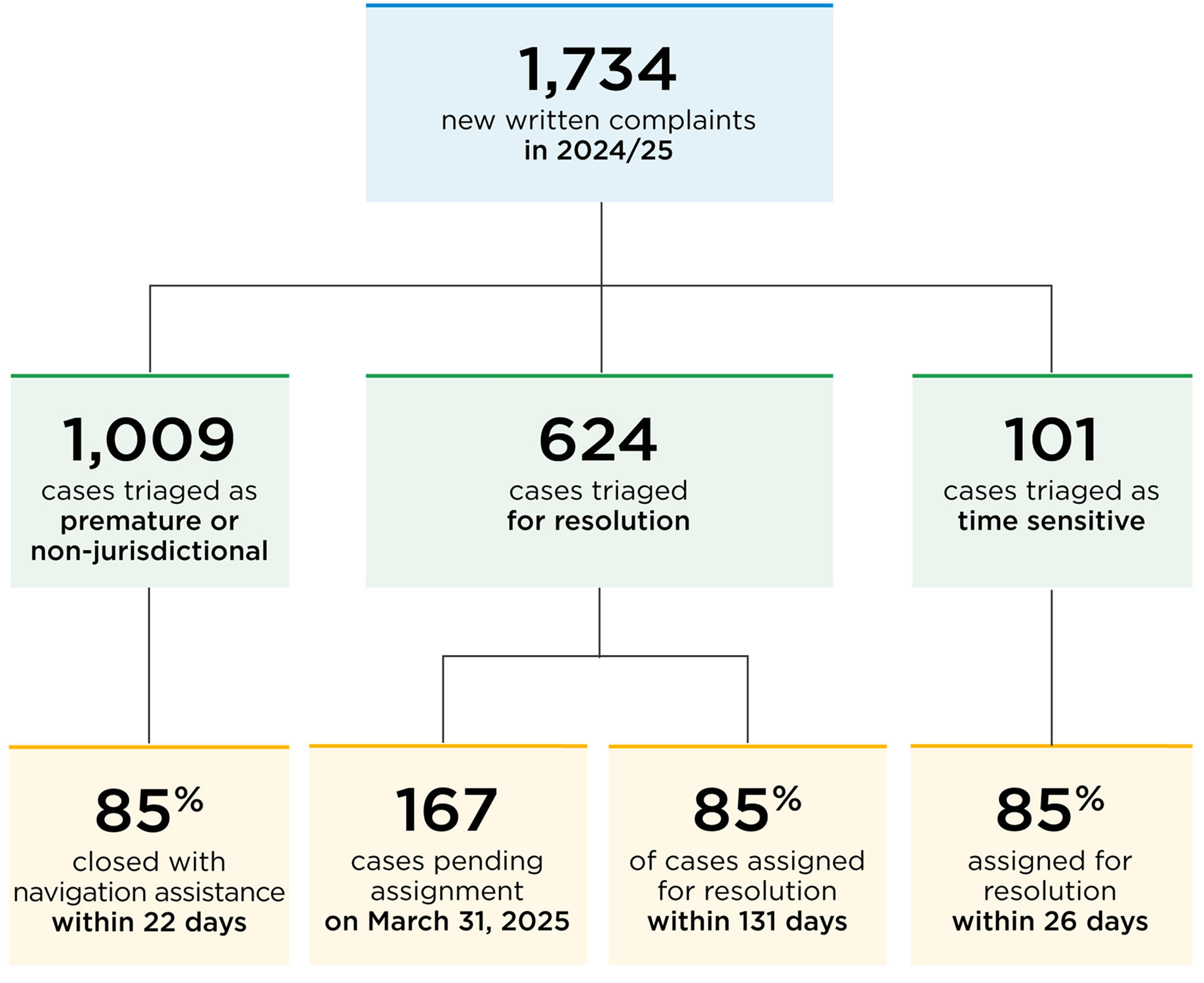 The office received a total of 4,886 new complaints in 2024/25 (April 1, 2024, to March 31, 2025), 1,734 written cases and 3,152 complaints to the call centre. This represents a 16% increase in new written complaints over 2023/24 and an 8% increase in new complaints to the call centre.